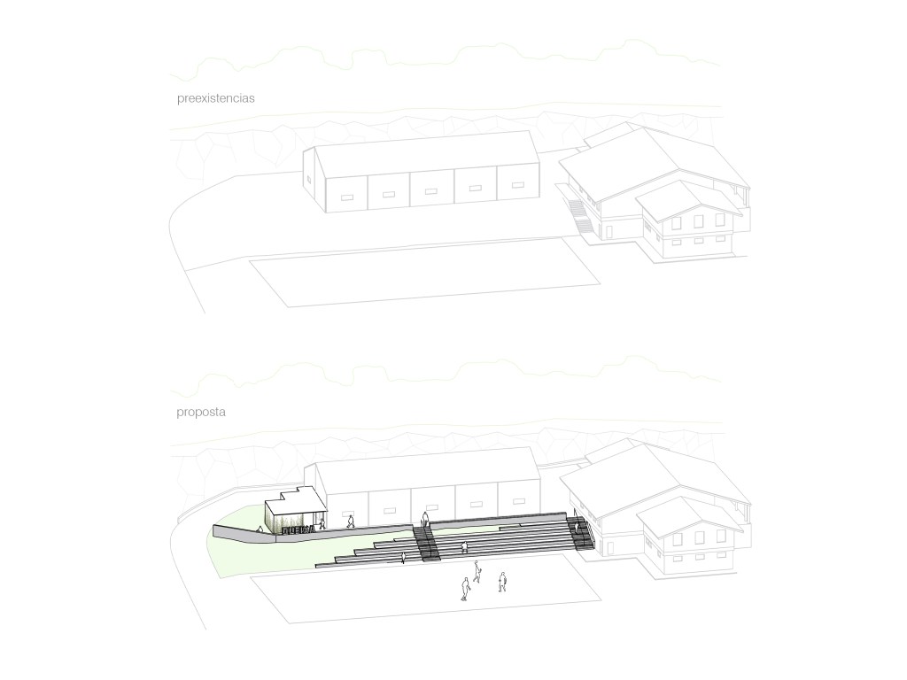 Se resuelve la topografía de la parcela tras la construcción de la nave dotando a la pista polideportiva de unas gradas que salven el desnivel entre ambas zonas.