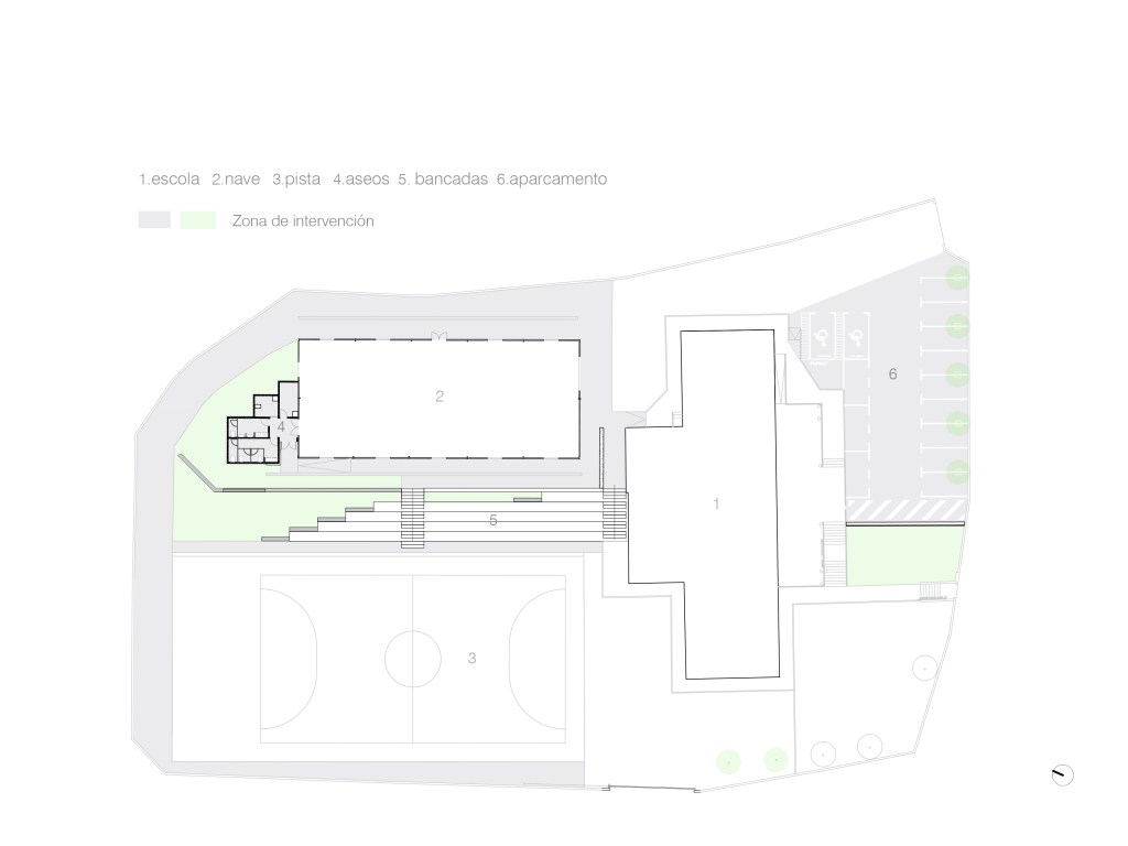 El proyecto tiene por objeto la intervención en la parcela del antiguo colegio de Celeiros, reconvertido en centro público de formación, que contiene una pista polideportiva y una nave de servicios municipales con auditorio.