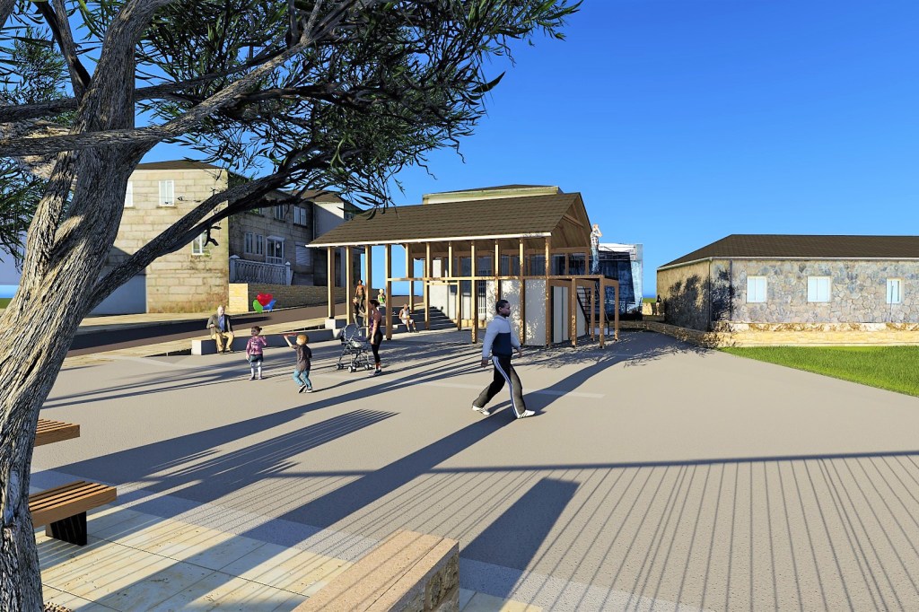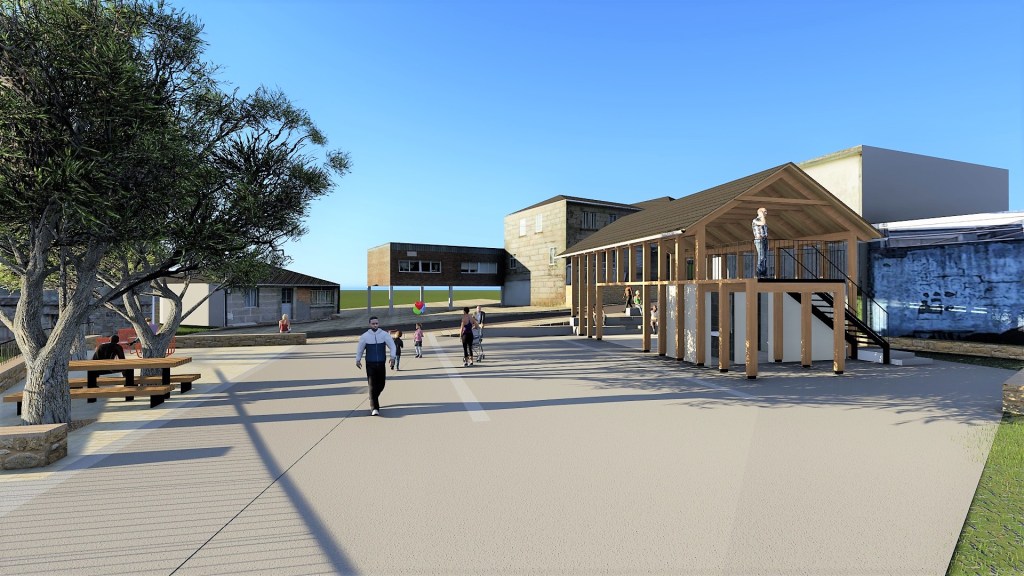 Como vivimos nun clima benigno pero marcado por épocas de choiva e, cada vez con máis frecuencia, épocas de calor, créase unha zona cuberta mediante unha pérgola ancorada volumétricamente ás edificacións existentes. Contará con aseos e un pequeno almacén, servindo de punto de apoio ás distintas actividades que se poidan realizar na praza como feiras, reunións, actividades recreativas e punto de saída de excursións polo municipio. A cuberta estará construída a dúas augas con madeira e lousa, materiais e volumetría acordes á contorna. Cun ritmo marcado polos piares e un gran oco cara á praza combina lixeireza cunha presenza de marcada horizontalidade. O faiado xerado sobre os aseos funcionará como miradoiro.