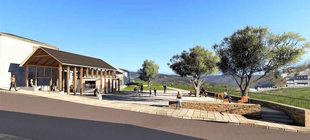 Como vivimos en un clima benigno pero marcado por épocas de lluvia y, cada vez con más frecuencia, épocas de calor, se crea una zona cubierta mediante una pérgola que se ancla volumétricamente a las edificaciones existentes. Contará con aseos y un pequeño almacén, sirviendo de punto de apoyo a las distintas actividades que se puedan realizar en la plaza como ferias, reuniones, actividades recreativas y punto de salida de excursiones por el municipio. La cubierta estará construida a dos aguas con madera y pizarra, materiales y volumetría acordes al entorno. Con un ritmo marcado por los pilares y un gran hueco hacia la plaza combina ligereza con una presencia de marcada horizontalidad. El altillo generado sobre los aseos funcionará como mirador.