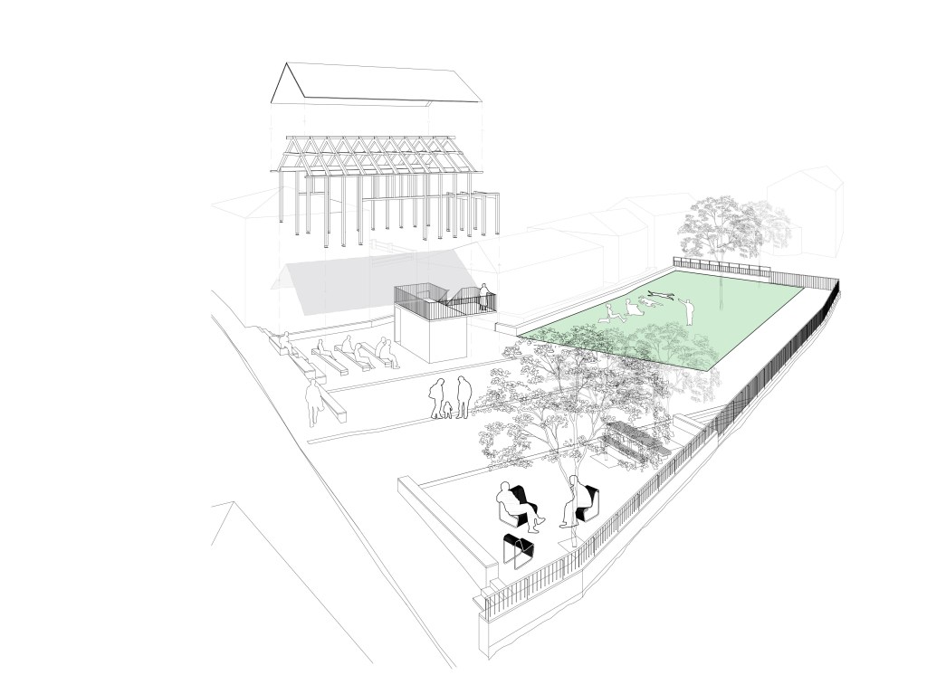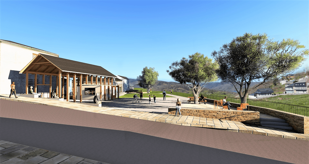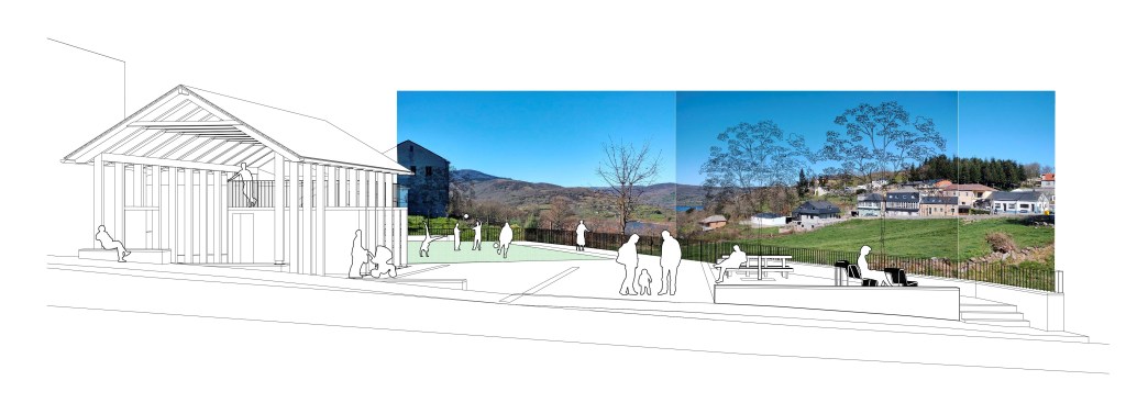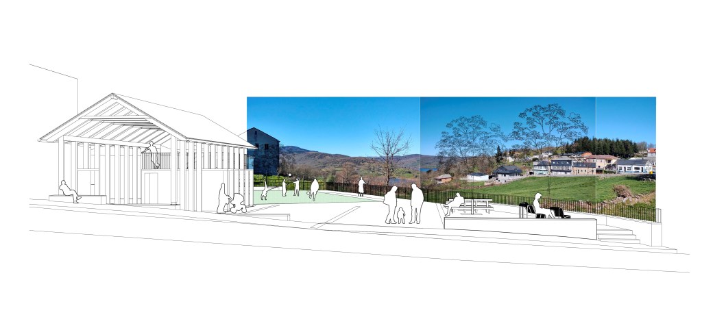 Como vivimos en un clima benigno pero marcado por épocas de lluvia y, cada vez con más frecuencia, épocas de calor, se crea una zona cubierta mediante una pérgola en la parte noreste que se ancla volumétricamente a las edificaciones existentes. Contará con aseos y un pequeño almacén, sirviendo de punto de apoyo a las distintas actividades que se puedan realizar en la plaza como ferias, reuniones, actividades recreativas y punto de salida de excursiones por el municipio. La cubierta estará construida a dos aguas con madera y pizarra, materiales y volumetría acordes al entorno. Con un ritmo marcado por los pilares y un gran hueco hacia la plaza combina ligereza con una presencia de marcada horizontalidad. El altillo generado sobre los aseos funcionará como mirador