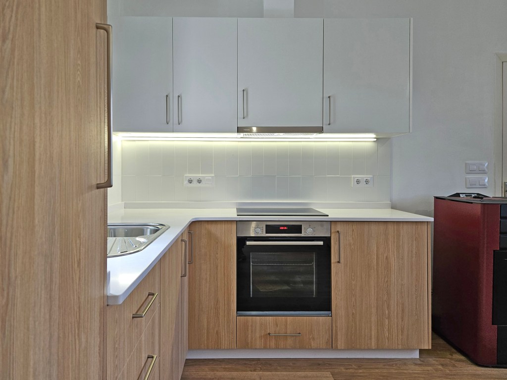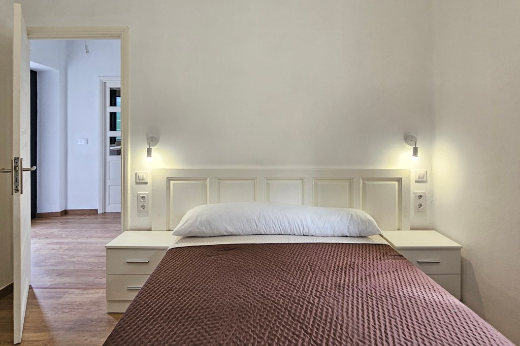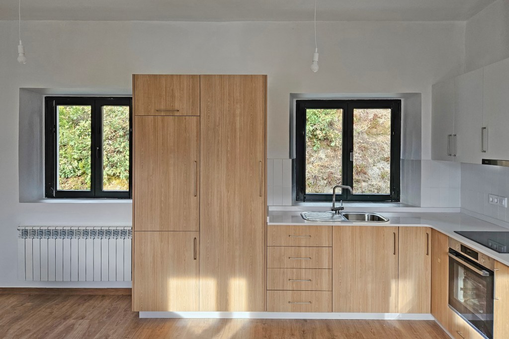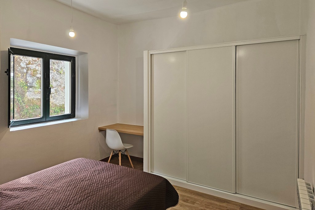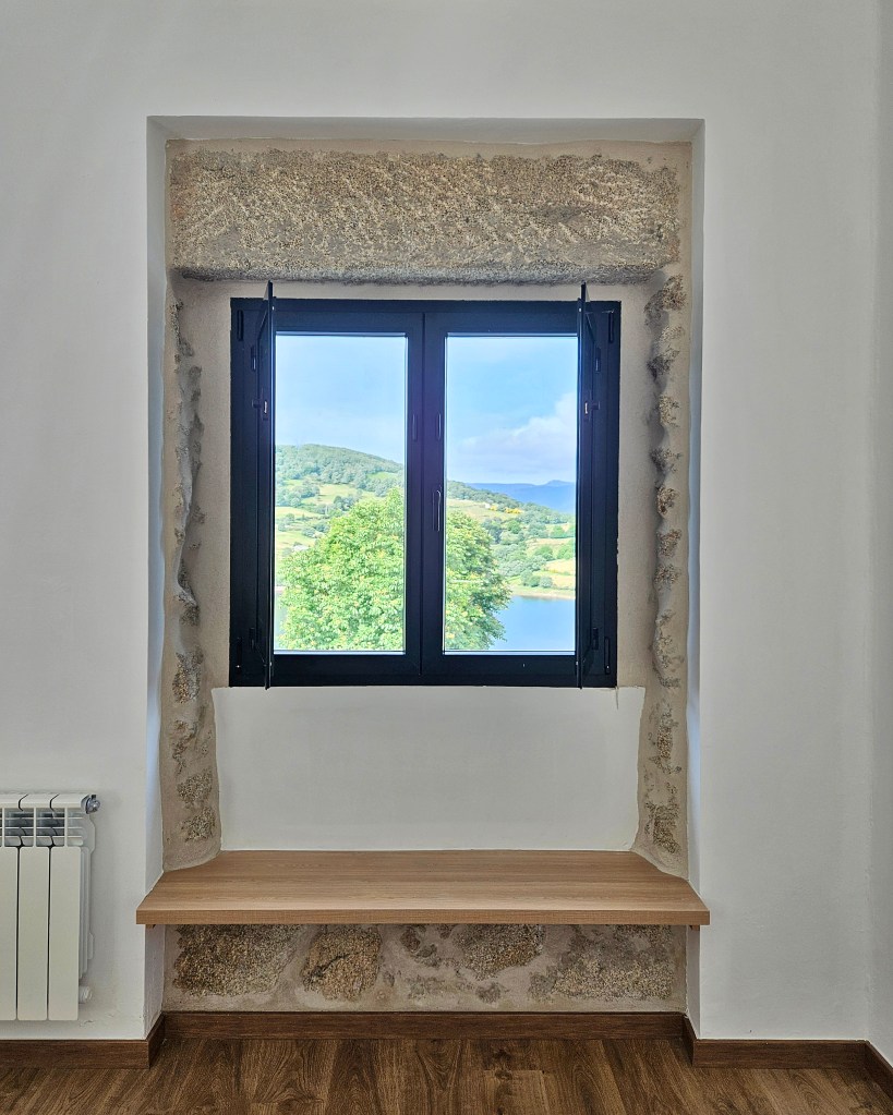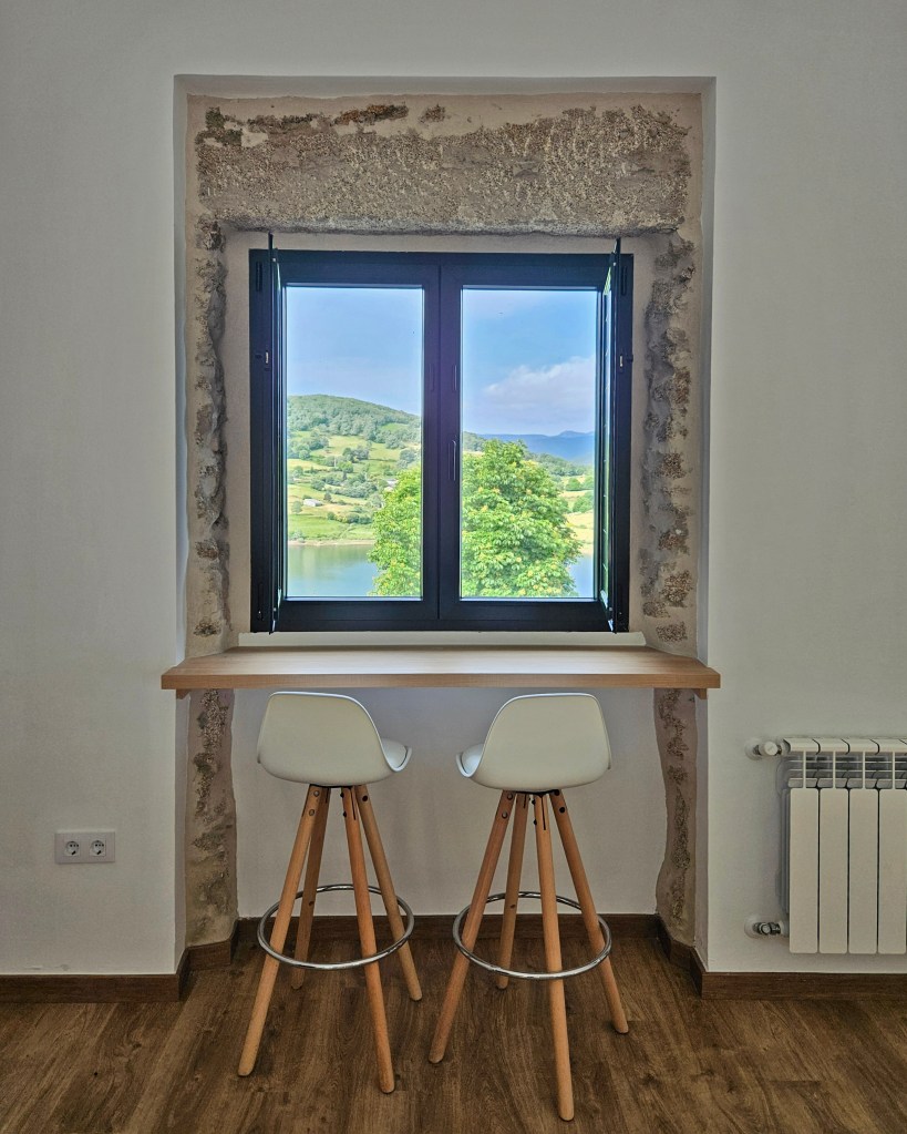 Se renuevan los acabados interiores y el equipamiento de baños, cocina y dormitorios, buscando un interior más confortable. En el salón un banco y una mesa alta permiten apreciar la piedra con la que están construidos los muros y se restaura la puerta abriendo tres cuarterones con vidrio para dar claridad al recibidor. Para mejorar su eficiencia energética se instala caldera de biomasa y un sistema aerotermia para el agua caliente, renovando por completo la instalación eléctrica.